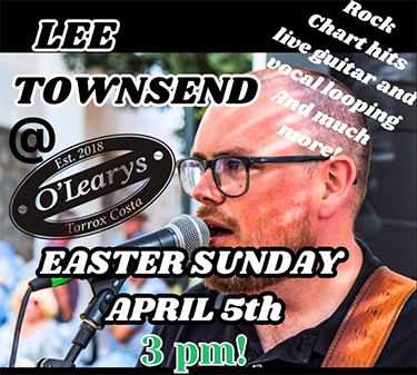 TORROX – De Britse zanger/gitarist Lee Townsend treedt zondagmiddag 5 april op bij O’Leary’s Bar aan de Paseo Maritímo de Ferrara in Torrox-Costa. Het optreden begint om circa 15.00 uur, de toegang is vrij.