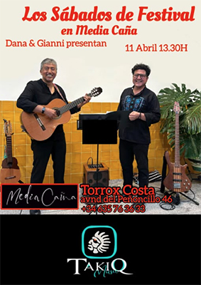 TORROX – Bij Chiringuito Medía Caña in de kustplaats Torrox is zaterdag 11 april vanaf 13.30 uur het Takiq Dúo te horen. Media Caña is te vinden aan de Avenida del Peñoncillo (de kustweg) 46 in Torrox, op circa tien kilometer van Nerja.
