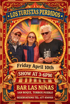 TORROX – De formatie Las Turistas Perdidos treedt vrijdagmiddag 10 april bij Bar Las Niñas in Torrox. Het optreden begint rond de klok van 15.00 uur en duurt tot circa 18.00 uur.