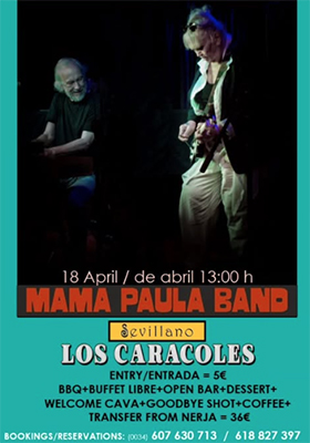 TORROX – Bij restaurante Los Caracoles del Sevillano aan de M-105 tussen Torrox en Frigiliana staat zaterdagmiddag 18 april een optreden geprogrammeerd van de Mama Paula Blues Band. De middag begint rond de klok van 13.00 uur.