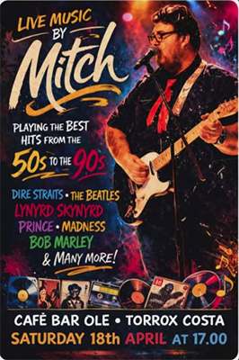 Zanger en gitarist Mitch treedt op in Cafe Bar Olé in Torrox TORROX – In de kustplaats Torrox, op circa tien kilometer afstand van Nerja, treedt zaterdagavond 18 april de zanger en gitarist Mitch op. Dit gebeurt bij Cafe Bar Olé aan de Calle Andalucía 14 in Torrox. Het optreden begint rond 17.00 uur. Delen: Delen op X (Opent in een nieuw venster) X Share op Facebook (Opent in een nieuw venster) Facebook Vind-ik-leuk Aan het laden...