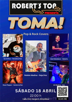 ALMUÑÉCAR – Bij bar/restaurant Robert’s Top, in de kustplaats Almuñécar speelt zaterdagavond 18 april de formatie Toma! Het optreden begint rond 22.00 uur en duurt ongeveer twee uur.