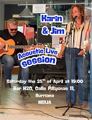 NERJA – De zangeres Karin Dijkshoorn en gitarist Jim Robinson treden zaterdag 25 april op in Nerja bij Bar H2O aan de Calle Filipinas, even vóór de boulevard van Playa Burriana.