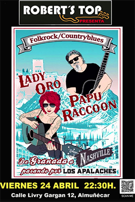 ALMUÑÉCAR – In bar/restaurant Robert’s Top in Almuñécar staat vrijdagavond 24 april een optreden geprogrammeerd van Lady Oro y Papu Raccoon. Het optreden begint rond 22.30 uur.