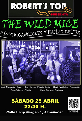 ALMUÑÉCAR – In bar/restaurant Robert’s Top in Almuñécar staat zaterdagavond 25 april een optreden geprogrammeerd van de band The Wild Mice. Het optreden begint rond 22.30 uur.