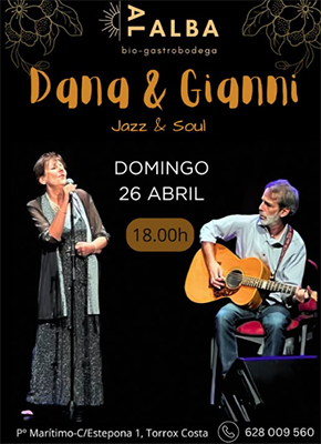 TORROX COSTA – Bij de bio-gastrobodega Al Alba in de kustplaats Torrox-Costa treedt zondagavond 26 april het regionaal vermaarde duo Dana Andrews & Gianni Piras op. Al Alba is te vinden aan de Paseo Marítimo/Calle Estapona 1 in Torrox-Costa, op circa tien kilometer van Nerja.