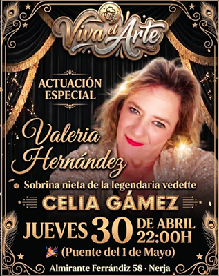 NERJA – Bij bar Viva el Arte in Nerja is donderdag 30 april een Latijnse show van Valeria Hernández te beleven. Cerveceria Viva el Arte is te vinden aan de Calle Almirante Ferrandis (in de volksmond Calle Cristo genoemd) 58 in het centrum van Nerja.